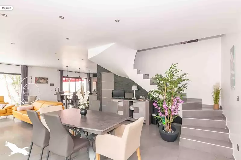 Villa T4 récente , avec des matériaux de qualité et de belles prestations. En rez de chaussée un séjour salon cuisine spacieux de 68 M² , une chambre avec salle d'eau et dressing ouvert sur un jardin avec spa. Un garage de 25 M² complète ce bien. Cette Villa vous permet de profiter d'un confort moderne dans un cadre agréable. Proposition d'aménagement virtuel non contractuelle en dernière photo.
