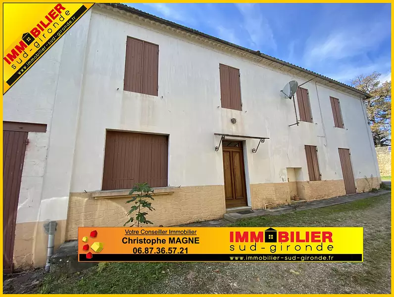 Moins de 10 mn de Langon, entrée de village, pour cette anceinne propriété viticole avec maison en pierre élevée d'un étage, composée en RDC d'une entrée, salon séjour, cuisine, une chambre, et dépendances (chai, cuvier, pressoir, garage et réserve), et à l'étage palier, sde, 3 chambres et un grenier. Le tout sur un terrain attenant pouvant être cultivé d'environ 7540 m2 avec source naturelle. Travaux à prévoir. Honoraires charge acquéreur. Ref 4489