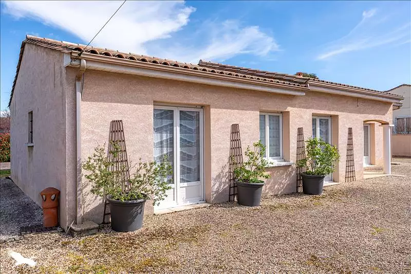 A quelques minutes du centre ville et des commodités, contemporaine de plain-pied offrant : entrée, cuisine équipée, vaste séjour traversant avec clim réversible, cellier/buanderie, chambre suitée (salle d'eau), 2 autres chambres et salle d'eau ; terrasse, double garage, abri de jardin, sur un jardin clos et arboré d'environ 800 m² Proposition d'aménagement virtuel non contractuelle en dernière photo.
