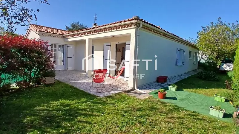 ROYAN 17200. Quartier Saint Pierre, très belle maison de plain pied, non mitoyenne comprenant une entrée lumineuse, une cuisine équipée donnant sur une grande terrasse exposée plein sud, un salon/salle à manger avec son poêle à bois, quatre grandes chambres avec placards, une salle de bain, une salle d'eau, deux toilettes.