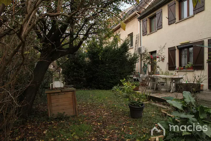 À l’extérieur, vous profiterez d’un jardin arboré à l’arrière de la maison, avec terrasse, idéal pour les repas en plein air et les après-midis en famille.
