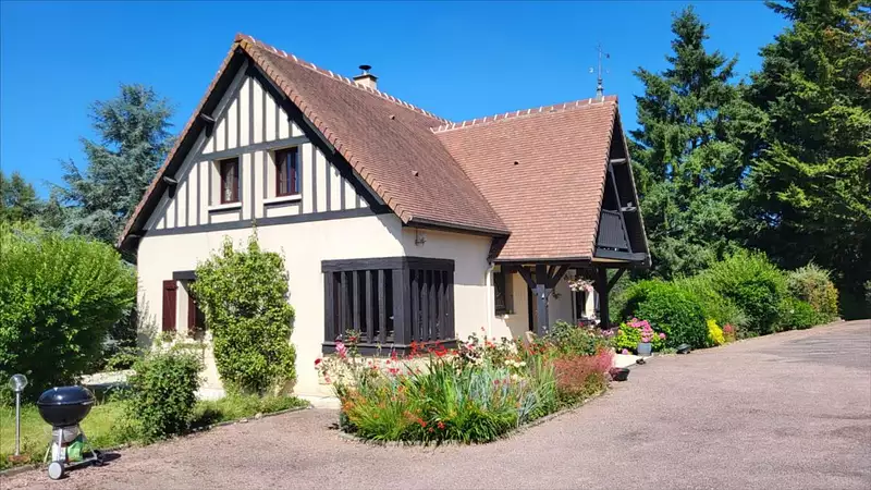 Dans un quartier au calme, à 1,5 km du centre ville de Vimoutiers, maison d'environ 133 m² bien entretenue comprenant : entrée avec placard-penderie, séjour avec baie vitrée donnant sur terrasse à l'extérieur et avec cheminée équipée d'un insert, cuisine aménagée et équipée (four, plaque de cuisson, hotte, lave-vaisselles), dégagement avec escalier desservant une salle de douche avec wc, une chambre ; à l'étage : couloir desservant trois chambres avec placard dont une avec balcon, salle de bains , wc séparés; sous-sol complet comprend partie garage, atelier, chaufferie et buanderie, avec adoucisseur d'eau, l'ensemble sur terrain arboré, avec source, allée goudronnée pour accès garage. Portail d'entrée électrique.