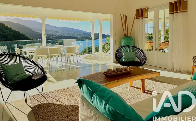 iad France - Hélène Moesta vous propose: Idéalement située dans les hauteurs prisées de Malendure à Bouillante, cette villa d'architecte entièrement rénovée offre un cadre de vie exceptionnel. Perchée pour capturer une vue dégagée sur la végétation tropicale luxuriante et la mythique Réserve Cousteau, le paradis des plongeurs, elle allie intimité absolue et proximité immédiate avec la plage, accessible en moins de 10 minutes à pied.