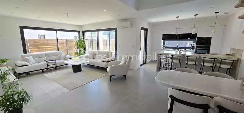 L'entrée avec une grande hauteur distribue un escalier design et dirige vers la vaste pièce de vie. La cuisine tout équipée avec l'électroménager haut de gamme ainsi qu'un plan de travail en pierre est sublimée par de grandes baies vitrées baignées de lumières ouvertes sur la terrasse plein sud offre un espace chaleureux aux volumes confortables. Climatisation sur l'ensemble de la pièce de vie.