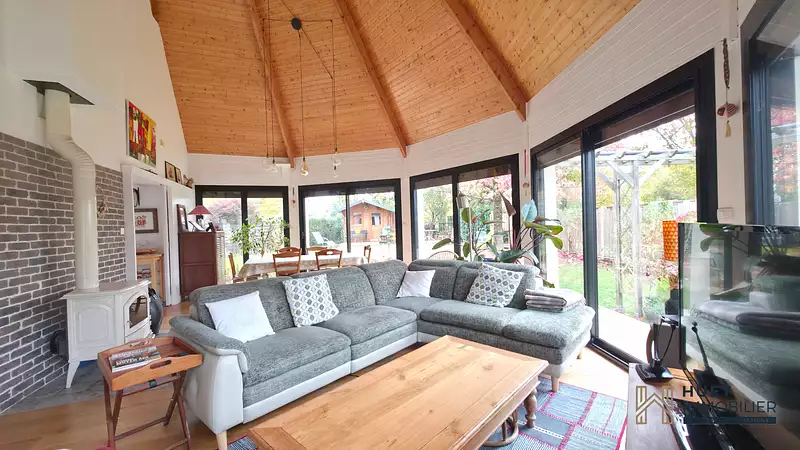 Sous son magnifique toit cathédrale, la pièce de vie baignée de lumière s’ouvre sur le jardin grâce à de larges baies vitrées offrant une vue panoramique sur la nature environnante.