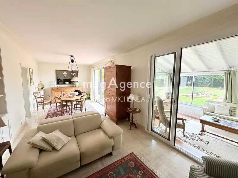 À l'extérieur, la maison dispose d'une belle exposition avec des orientations sud, est et ouest, mettant en valeur le jardin. La façade bien entretenue, les menuiseries en double et triple vitrage, les volets roulants automatiques et le toit en ardoise contribuent à l'esthétique et à la fonctionnalité. L'aspiration centralisée, le vide sanitaire et la cheminée intégrée au séjour sont des atouts supplémentaires.