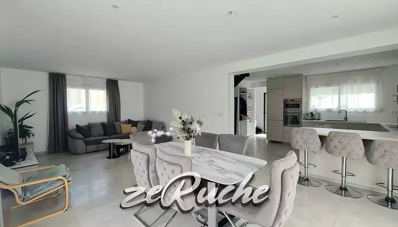 Au rez-de-chaussée, découvrez d'abord une belle entrée avec son aménagement dressing qui vous mènera dans une spacieuse pièce à vivre avec sa cuisine ouverte aménagée et équipée.