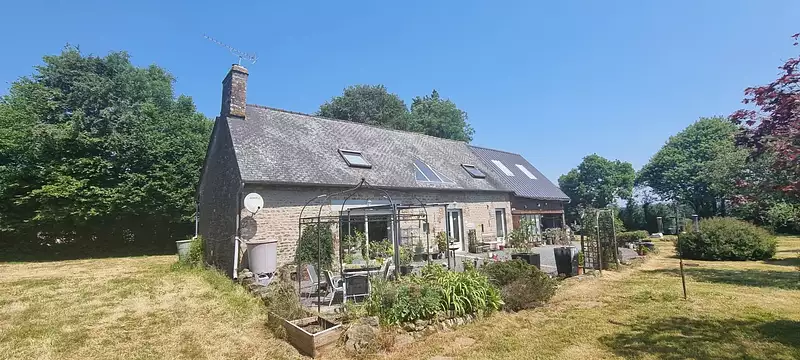 Maison indépendante en pierre, habitable, orientée sud, 3 chambres + garage attenant avec de belles vues sur un terrain d'environ 1.5 hectares ; environ 8km de la ville de Villedieu les Poeles et environ 14km d'Avranches et du début de la côte.