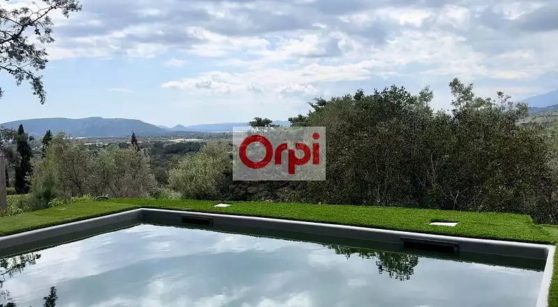 Un espace extérieur aménagé d'une piscine avec nage à contre courant, d'une terrasse exposée Sud avec vue mer et de très beaux oliviers.