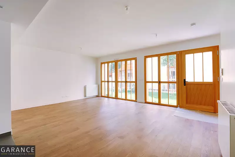 Le rez-de-chaussée, donnant sur un le jardin privatif de 24 m2, s'ouvre sur une entrée menant à un vaste séjour de 39 m² avec salle à manger et cuisine ouverte, une buanderie et des WC séparés. Traversant, il profite d'une luminosité optimale grâce à de larges baies vitrées.