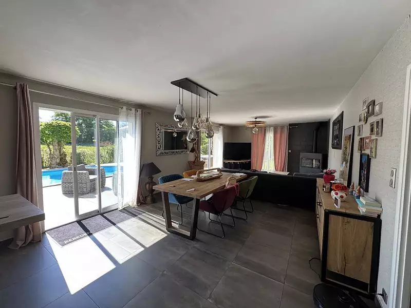 La maison se compose : d'une entrée avec placard, une belle pièce de vie avec poêle, cuisine équipée donnant sur la terrasse sans vis à vis, quatre chambres dont une au RDC avec salle d'eau privative.