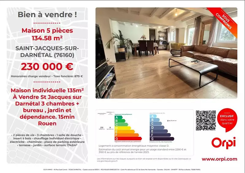 Venez découvrir avec votre agence Orpi Elvia immo cette maison ancienne rénovée à Saint-Jacques sur Darnétal dans un environnement verdoyant et calme, comprenant : une entrée , dégagement, séjour avec cheminée, grande cuisine avec coin repas 29m², une chambre, salle de douche et WC indépendant.