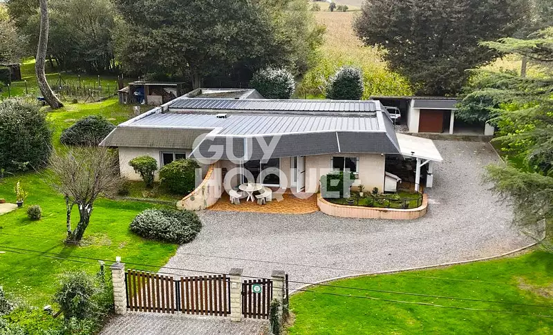 Entre Saint Sever et Hagetmau, au coeur d'un agréable enclos arboré de 3636 m², nous vous proposons à la vente cette atypique maison d'architecte de plain pied d'environ 134 m² comprenant une spacieuse pièce de vie de 51 m² avec cheminée ouverte et disposant d'un accès direct sur une terrasse couverte, cuisine indépendante , 3 chambres, salle d'eau avec douche et baignoire, WC séparé et garage. L'ensemble se complète d'une dépendance de 37 m² accueillant un double garage supplémentaire et divers abris. A la recherche d'un bien à la fois atypique et fonctionnel, ce bien est fait pour vous! Contactez votre agence Guy Hoquet Hagetmau pour programmer votre rdv de visite. (6.51 % honoraires TTC à la charge de l'acquéreur.)