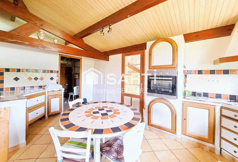 À l'intérieur, la maison offre un séjour avec poutres apparentes et cheminée, une cuisine/salle à manger ouverte, 4 chambres, un cellier, une salle de bain avec baignoire, et un WC séparé. Un charme indéniable et un agencement fonctionnel, idéal pour une vie de famille paisible à la campagne.