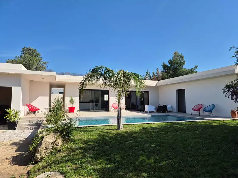 Cette maison contemporaine entièrement climatisée de 135 m2 est située au calme, sur la route de Calenzana sur un terrain de 1000 m2 env.