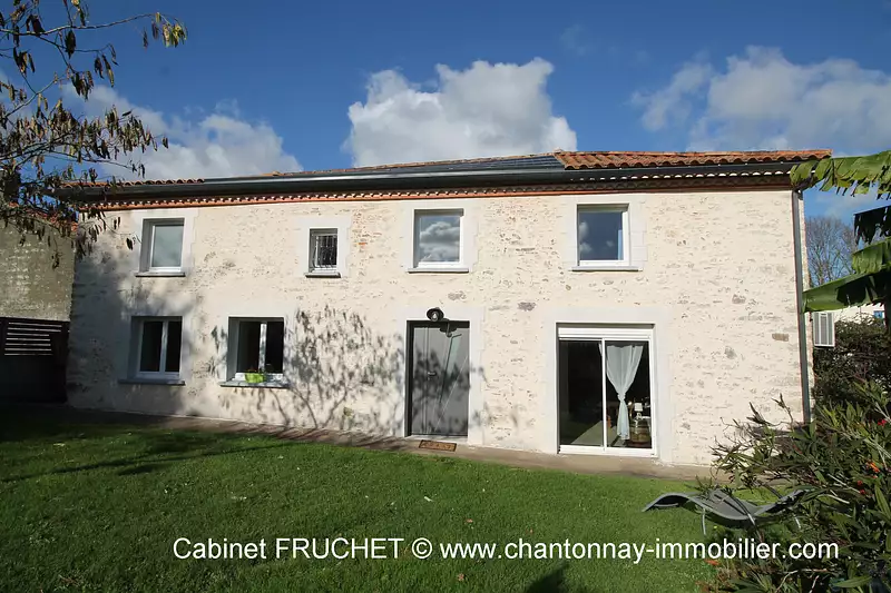 Réf 6714 - Axe CHANTONNAY - STE HERMINE. Dans hameau paisible. Maison en pierre rénovée avec goût offrant 135 m2 habitables. Elle se compose comme suit. Au rez-de-chaussée : Séjour avec poêle à bois ouvert sur une cuisine équipée, salon, dégagement, salle d'eau, wc, cellier/buanderie. A l'étage: Palier, wc et trois chambres dont une avec salle de bains. Garage et divers toits. Terrasse donnant sur agréable terrain d'environ 1 700 m2. Les plus de cette maison: Toiture récente, panneaux solaires (env. 1800€/an), assainissement récent, ouvertures PVC/DV, chauffage par aérothermie, fibre.