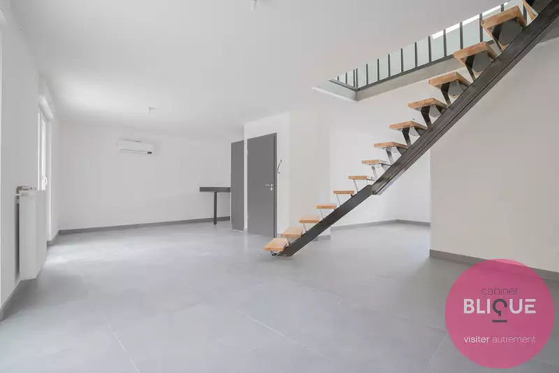 À l’étage : une spacieuse pièce de vie de 50 m2 baignée de lumière, deux chambres de 13 m2, une salle de bain avec WC.