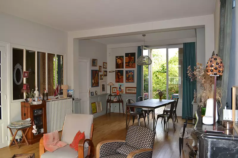 SOUS COMPROMIS. Maison ancienne rénovée avec goût, 135 m² au sol , comprenant au RDC: entrée, salon/séjour traversant, cuisine aménagée/équipée donnant sur terrasse, 1 salon/chambre, à l'étage : 3 chambres sur jardin, bureau, SDB avec douche et baignoire, grenier. Sous-sol partiel. Beau jardin donnant sur d'autres jardin. Pas de vis-à-vis. Au calme, proche des transports (C1 et tram 1) des écoles et commerces. (2.95 % honoraires TTC à la charge de l'acquéreur.)