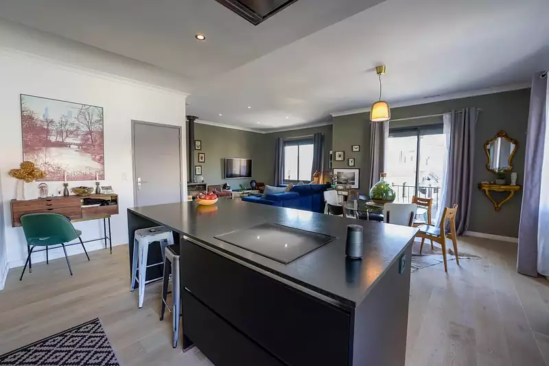 Poële AAsgard en pierre naturelle dans le salon. Plan de travail cuisine et îlot central en granit, béton ciré et parquet chêne brossé au sol, carrelage métro et marbre travertin dans salle d'eau. Toiture révisée.