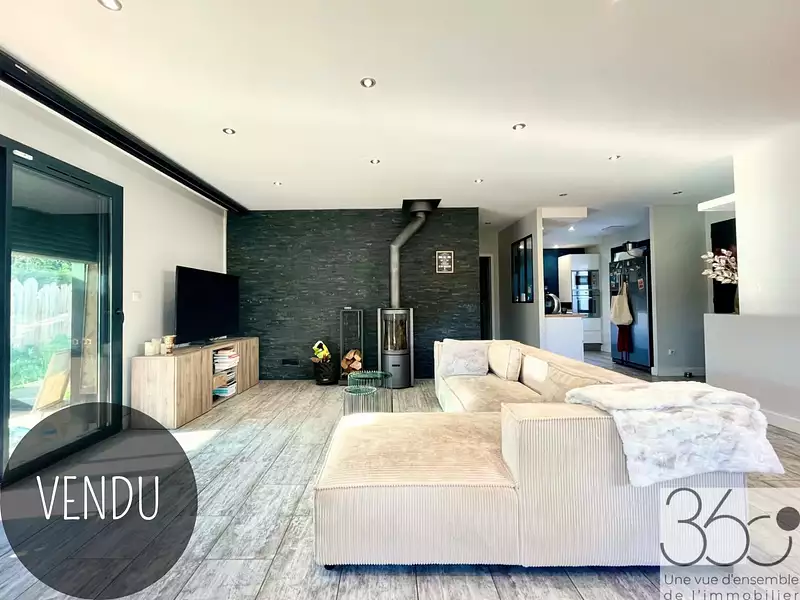 Depuis l’entrée, vous accédez à l’espace de vie lumineux de plus de 45m², composé d'une cuisine équipée semi ouverte, d'une salle à manger et d’un salon avec poêle à bois, donnant sur une véranda.
