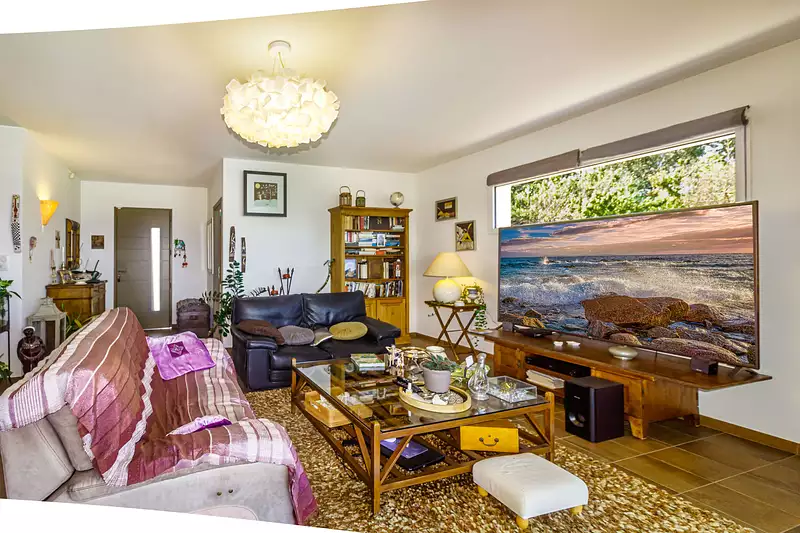 Prestations haut de gamme : piscine maçonnée, climatisation, poêle à bois, baie vitrée et volets électriques.