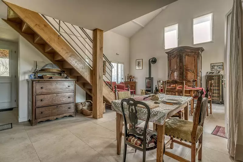 Dès l'entrée, la hauteur sous plafond impressionne. Le salon cathédrale, traversant et chaleureux, forme avec la cuisine ouverte un espace de vie de près de 45 m², baigné de lumière. Le poêle à bois y apporte sa touche de confort, pour des hivers doux, même face aux grands espaces.