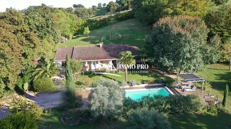 Au calme, dans un écrin de verdure, sans voisinage immédiat, à 50mn de Toulouse et 5mn des commodités, Villa contemporaine de plain-pied, d'environ 135m² habitables sur un joli terrain de 5.900m² arboré avec piscine et terrasse. Très BON DPE classé B.