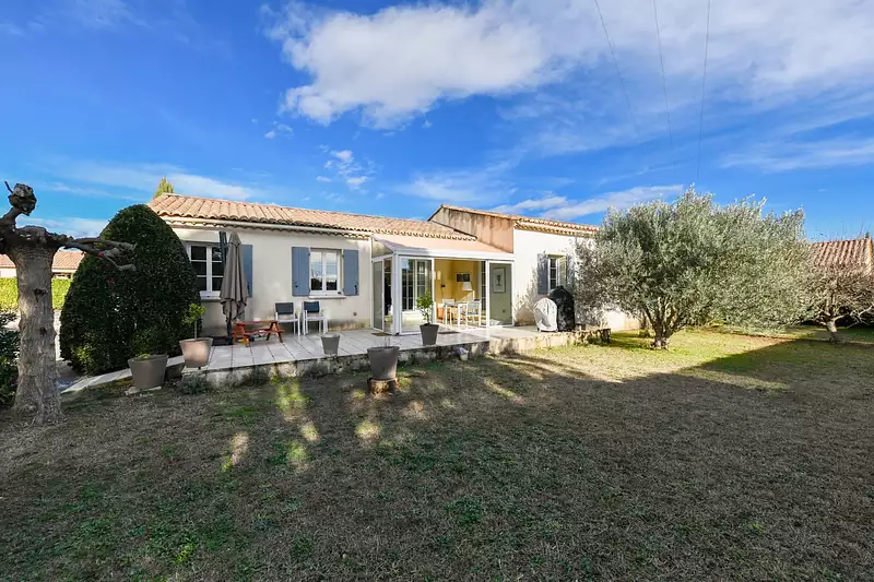 A 5 minutes d'Uzès, dans un village avec commerces, villa de 2003 avec piscine offrant un bel espace de vie (séjour-cuisine américaine) ouvrant sur la terrasse exposée plein sud et sans vis-à-vis.