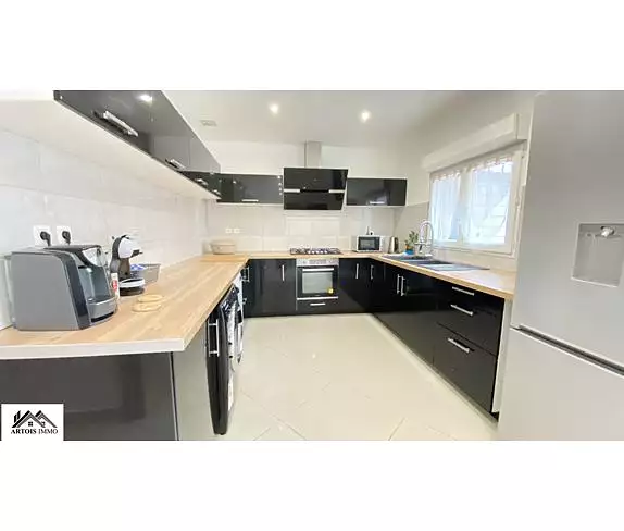 L'agence Artois Immo vous propose en exclusivité sur la commune de Lievin 62800 cette maison en semi plain pied offrant hall d entrée, salon, séjour, cuisine équipée, 4 chambres, wc, 2 salle d'eau, cave, jardin, dépendance.