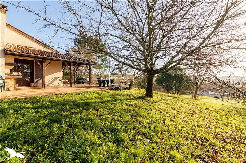 Secteur Prayssas, villa traditionnelle de plain pied de type 5 sur un joli terrain avec une belle vue composé d'une salle à manger et salon avec cheminée, une cuisine, 3 chambres, une salle de bain. A l'extérieur, un garage de 50 m², une grande terrasse offrant une vue dominante et dégagée sur la vallée, le tout sur environ 7000 m²