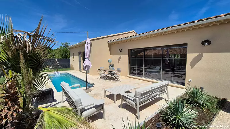 Alerte opportunité Côté Ventoux ! Une maison neuve, tout juste construite et donc habitable sans délais et sans soucis ! Venez découvrir cette belle villa de plain-pied d'environ 136 m² avec piscine et garage. Elle est vendue avec sa cuisine équipée et offre des prestations de qualité. Cette maison moderne se compose d'une pièce à vivre très lumineuse de 53 m², de 4 chambres dont une suite parentale avec dressing et salle d'eau privative de 25 m², d'une salle de bain avec douche italienne et baignoire, et d'un garage. De nombreux rangements ajoutent à la fonctionnalité des lieux. Le joli jardin de 542m² vous invite à la détente... Agrémenté d'oliviers et disposant de l'eau du canal de Carpentras, il est très agréable avec sa piscine 2x7 parfaitement intégrée dans l'espace ! Prestations ++ avec un chauffage réversible gainable, de très belles menuiseries, un portail et porte de garage automatiques, une cuisine contemporaine... c'est un coup de coeur ! Pour un achat en toute sérénité contactez Kévin au 0769085522. Côté Ventoux Immobilier a le plaisir de vous accueillir dans ses agences disposant d'un parking à AUBIGNAN et MAZAN. Vous pouvez estimer gratuitement votre bien en ligne sur notre site : Les informations sur les risques auxquels ce bien est exposé sont disponibles sur le site Géorisques : www.georisques.gouv.fr