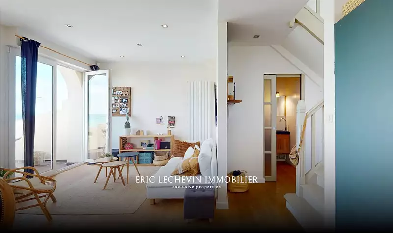 Au 1er étage : bel espace de vie avec séjour salon cuisine entièrement équipée , terrasse face mer .