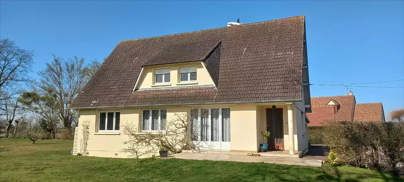 Dans environnement très calme, une maison d'habitation de 136 m2 avec 5 chambres, comprenant :- au rez-de-chaussée : entrée, cuisine aménagée et équipée, séjour-salon, couloir avec placards, 2 chambres avec placards, WC, salle d'eau avec douche à l'italienne. - à l'étage : bureau ou dressing, trois chambres et salle d'eau à terminer (arrivées d'eau). Garage carrelé avec porte automatique et buanderie. Chauffage FUEL (chaudière récente) Adoucisseur d'eau et relié au tout à l'égout. Garage préfabriqué. Terrain arboré, le tout sur 1606 m2