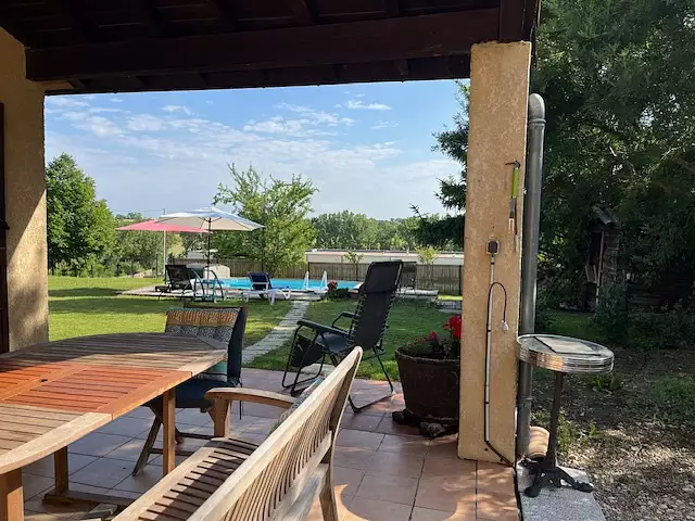 Côté jardin vous profiterez d'un beau terrain plat de 2090 M2, d'une piscine, et un espace repas couvert.