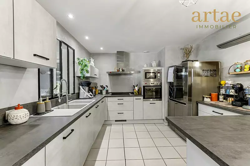 Dans l'espace jour de la maison vous trouverez un salon d'environ 45m2 donnant sur une cuisine ouverte équipée et aménagée, totalement rénovée il y a 3ans de 12m2, ouvrant sur buanderie. Il est prolongé d'un accès direct sur une véranda de 25m² entièrement fermée par de larges baies vitrées offrant une vue dégagée sur la terrasse et la piscine.