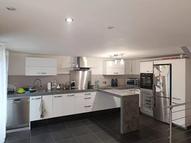 Etage 1 : espace de vie, cuisine ouverte et salon séjour.