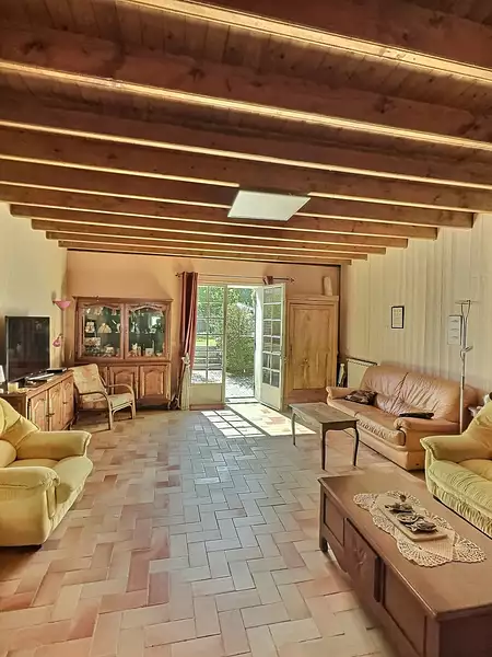 Elle est composée d'une belle pièce de vie idéalement exposée et donnant sur une terrasse avec son jardin ombragé par quelques beaux arbres fruitiers, d'un grand espace cuisine avec sa belle cheminée, d'une salle d'eau, un dressing, un coin buanderie, et deux grandes chambres.