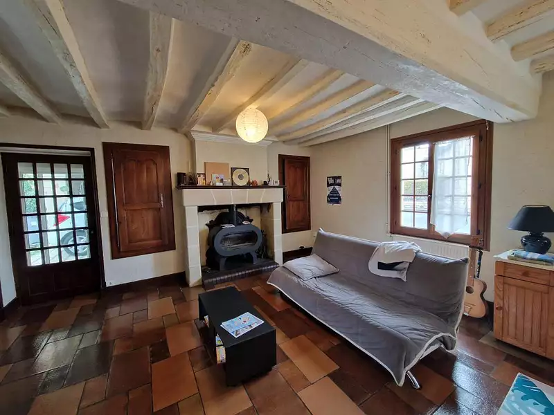 Au rez-de-chaussée, la maison dispose d'un chaleureux salon - séjour agrémenté d'un poêle à bois, parfait pour les soirées d'hiver. Vous y trouverez également une chambre, une cuisine, une salle de bain et un WC.