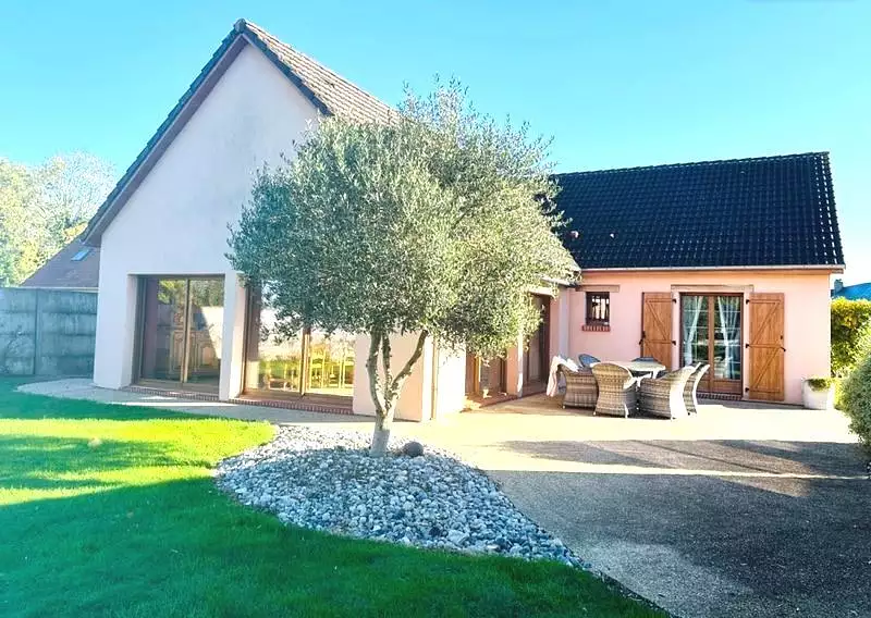 Elle offre : hall d'entrée, grand séjour cathédrale de 41 m² avec poêle à granulés, très lumineux avec ses grandes baies vitrées donnant sur le jardin, surplombé par une mezzanine faisant office de bureau ou d'espace de repos, grand salon de 31 m² avec un insert, cuisine équipée et aménagée, couloir desservant 3 chambres avec rangements dont 1 avec un accès sur la terrasse, salle d'eau et WC séparés. Surface habitable de 137 m² environ.