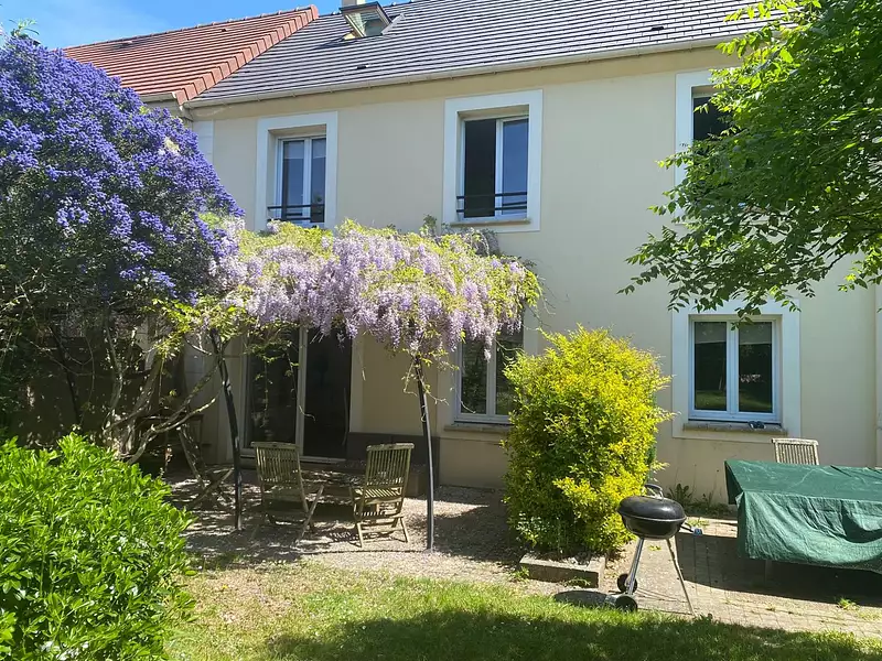 Magnifique jardin de 500 m², sans vis à vis, bien exposé et arboré avec une terasse et pergola, idéal pour se détendre, recevoir ou laisser les enfants jouer en toute tranquillité.