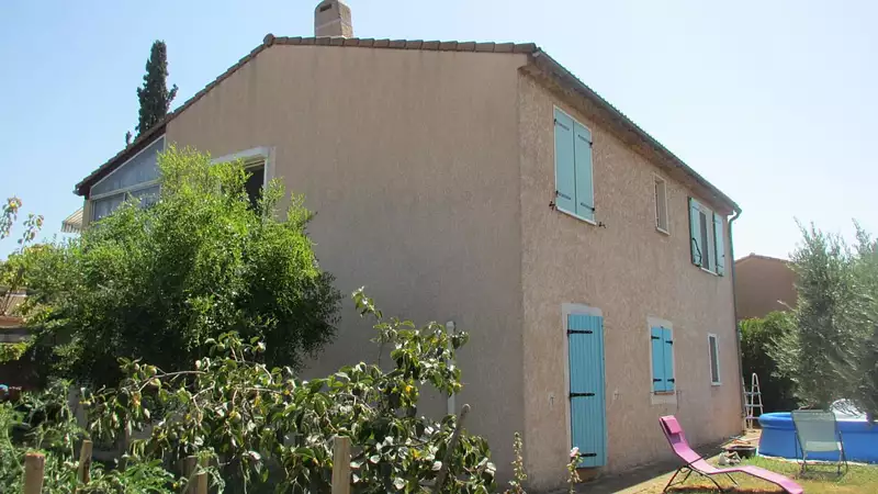 A l'étage : une entrée, une salle de séjour, un salon, une cuisine de belle qualité, équipée et indépendante, 2 chambres, salle d'eau avec douche italienne, WC, 3 climatisations réversibles, menuiseries PVC double vitrage, volets aluminium, chauffage central avec pompe à chaleur, 2 forages et eau de ville. bâtie sur 669 m2 de jardin clôturé.