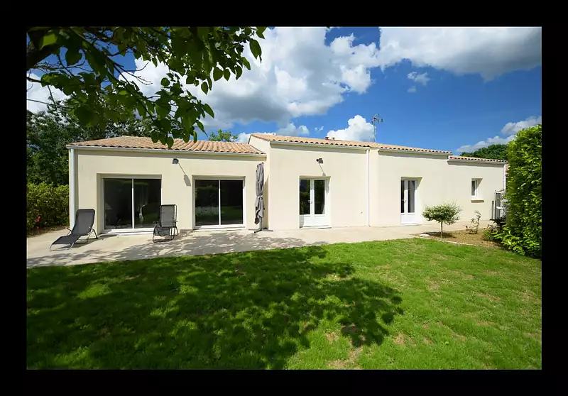 TRES BEAU PLAIN PIED EN PARFAIT ETAT 2015 138 M2 - SEJOUR LUMINEUX 53 M2 PLEIN SUD - 3 CHAMBRES - GARAGE SPACIEUX - TERRASSE 170 M2., A 20 min de la Rochelle dans un village avec les commodites a pied : maison plain pied d'une surface de 138 M2 comportant une superbe de vie lumineuse de 53 M2 avec de grandes baies vitrees, une exposition au sud, une cuisine independante amenagee non equipee (sauf hotte aspirante et plaques de cuisson) : acces a une terrasse carrelee de 170 M2 ., La partie nuit comporte trois chambres, une salle de bains privative a la chambre parentale (baignoire d'angle, douche, 2 vasques, wc), une salle d'eau privative pour chaque chambre, 1 wc., Carrelage sobre au sol et parquet flottant dans les chambres, chauffage au sol electrique avec une pompe a chaleur, huisserie en pvc, double vitrage, volets roulants electriques., Garage carrele de 20 M2 avec une porte motorisee., Parcelle de terrain de 785 M2, nouvelle semence de gazon en cours, piscinable, assainissement a...