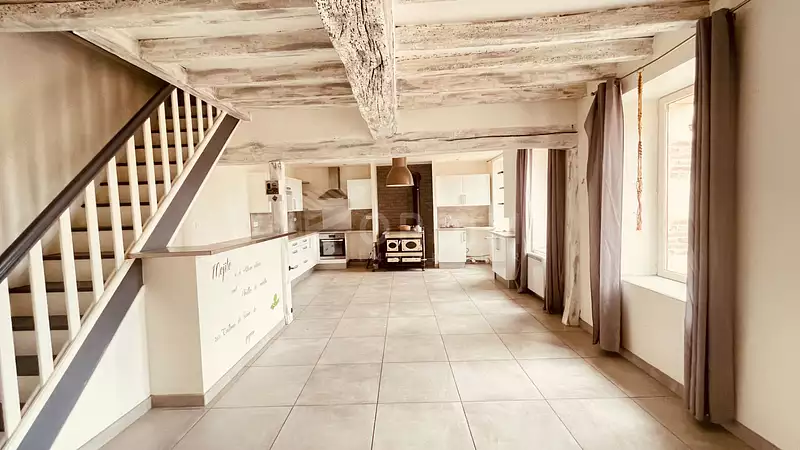 Ancien corps de ferme rénové avec : Entrée, grande pièce à vivre avec cuisine équipée ouverte avec cuisinière à bois/poêle, chambre, salle d'eau/WC. Travaux de finitions à réaliser sur l'entrée et la salle d'eau. A l'étage : palier, chambre, dressing, chambre ou bureau traversant, suite parentale avec salle de bains, WC; Grande dépendance avec grange, garage, écuries et cave. Grand terrain sur l'arrière avec appentis et accès indépendant. Chauffage bois et électrique, panneaux solaires photovoltaïque. Terrain constructible sur l'arrière.