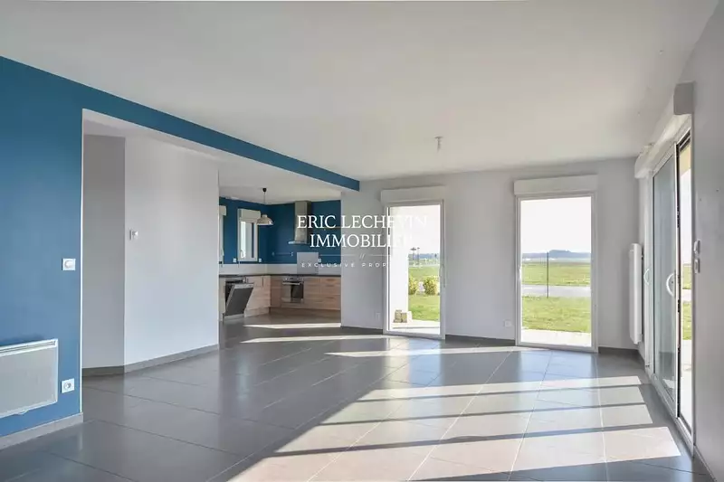 Séjour salon de 36 m² ouvert sur une cuisine équipée de 15m² et d'un cellier .