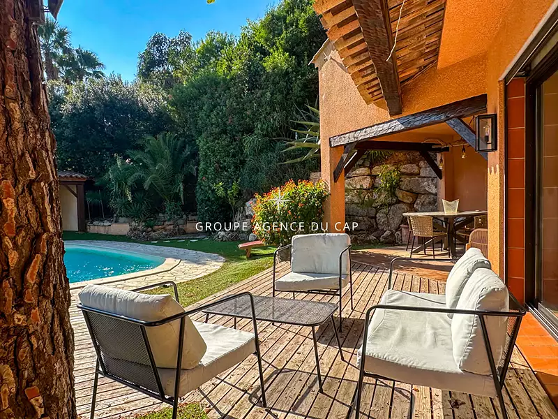 Nichée dans un écrin de verdure , cette charmante villa de 139 m²,entierement rénovée, offre un cadre de vie paisible et sans vis a vis . Nous retrouvons au RDC un agréable hall d entrée, une première chambre avec terrasse et dressing , ainsi qu'une salle de bain . A mi-niveau, se trouve une seconde chambre. Enfin le rdj accueille un cellier, un toilette invités et une vaste chambre parentale. Son espace de vie séduit par sa belle hauteur sous plafond, sa luminosité et ses larges baies vitrées ouvrant sur une agréable terrasse couverte et les espaces extérieurs autour de la piscine chauffée. Un cellier et un toilette indépendant complètent l ensemble. Une pièce indépendante aménagée en salle de sport peut également être transformé en studio ou suite, parfait pour accueillir des invités ou créer une activité locative. atelier et cabanon de rangement s ajoutent a la villa . Un véritable havre de paix
