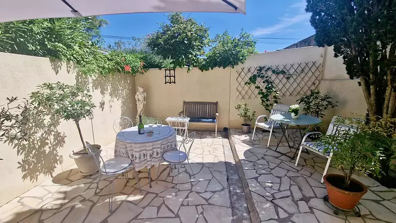En passant par les grandes portes coulissantes, vous vous retrouvez dans une belle cour privée qui offre à la fois des zones ensoleillées et ombragées pour s'asseoir et siroter un vin rosé frais, pour lequel la région est bien connue.