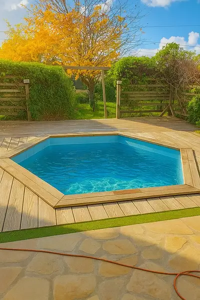 * Véranda haut de gamme ouvrant sur une terrasse en bois et sa piscine semi-enterrée
