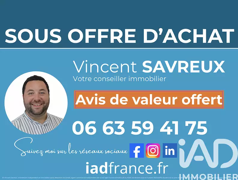 La présente annonce immobilière a été rédigée sous la responsabilité éditoriale de M Vincent Savreux mandataire indépendant en immobilier (sans détention de fonds), agent commercial de la SAS I@D France immatriculé au RSAC de Amiens sous le numéro 932144975, titulaire de la carte de démarchage immobilier pour le compte de la société I@D France SAS.