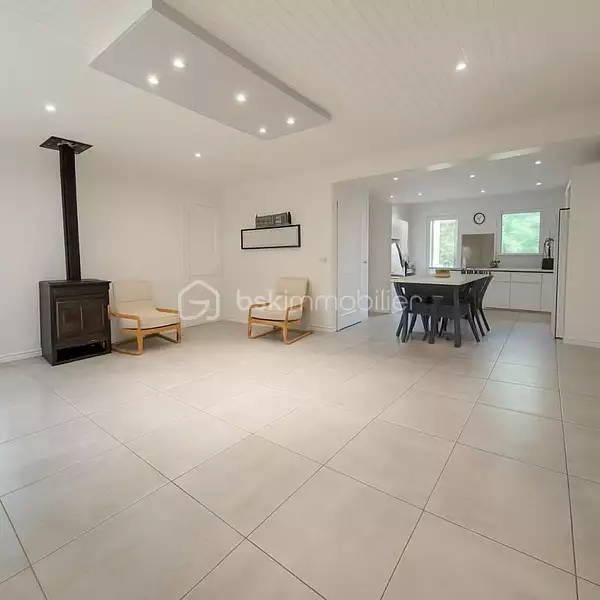 Grande pièce de vie lumineuse de plus de 40 m² avec poêle à bois