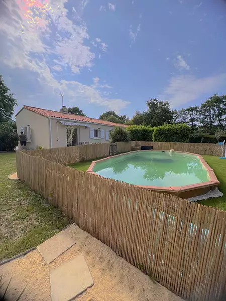 MAISON DE PLAIN PIED EN PARFAIT ÉTAT PROCHE ST BREVIN LES PINS AU CALME, SUR UN TERRAIN DE 2100 M2 , LA MAISON PRÉSENTE DANS SA PARTIE PRINCIPALE UNE ENTRÉE, UN SALON/SÉJOUR AVEC CHEMINÉE INSERT+ RECUPÉRATEUR DE CHALEUR, UNE CUISINE SÉPARÉE AMÉNAGÉE/ ÉQUIPÉE, 3 CHAMBRES, UNE SALLE DE BAINS, UN WC SÉPARÉ. L'EXTENSION ATTENANTE PROPOSE UN BUREAU OU UNE CHAMBRE, UNE CUISINE, UNE SALLE D'EAU ET UN DRESSING. GARAGE AVEC FAUX GRENIER , CHALET EN BOIS.PISCINE CHAUFFÉE, MAISON SANS VIS A VIS. Honoraire d'agence 4% inclus charge acheteur